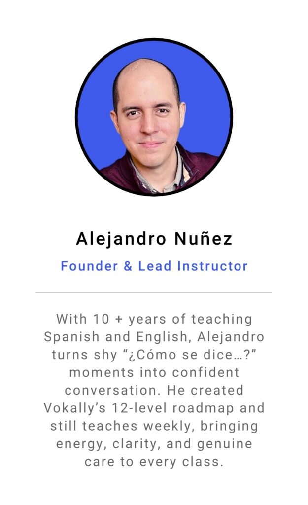 Vokally began in Boston, MA, as New Way Spanish, a one-person tutoring project Alejandro started after noticing how traditional courses (high school or college classes) left learners confident on paper but silent in real life. Word-of-mouth classes grew into a full language program with live online lessons, immersion events, and a tight-knit community.