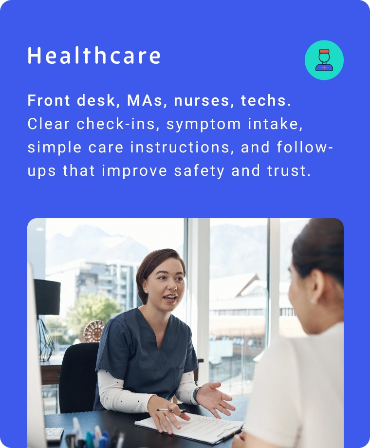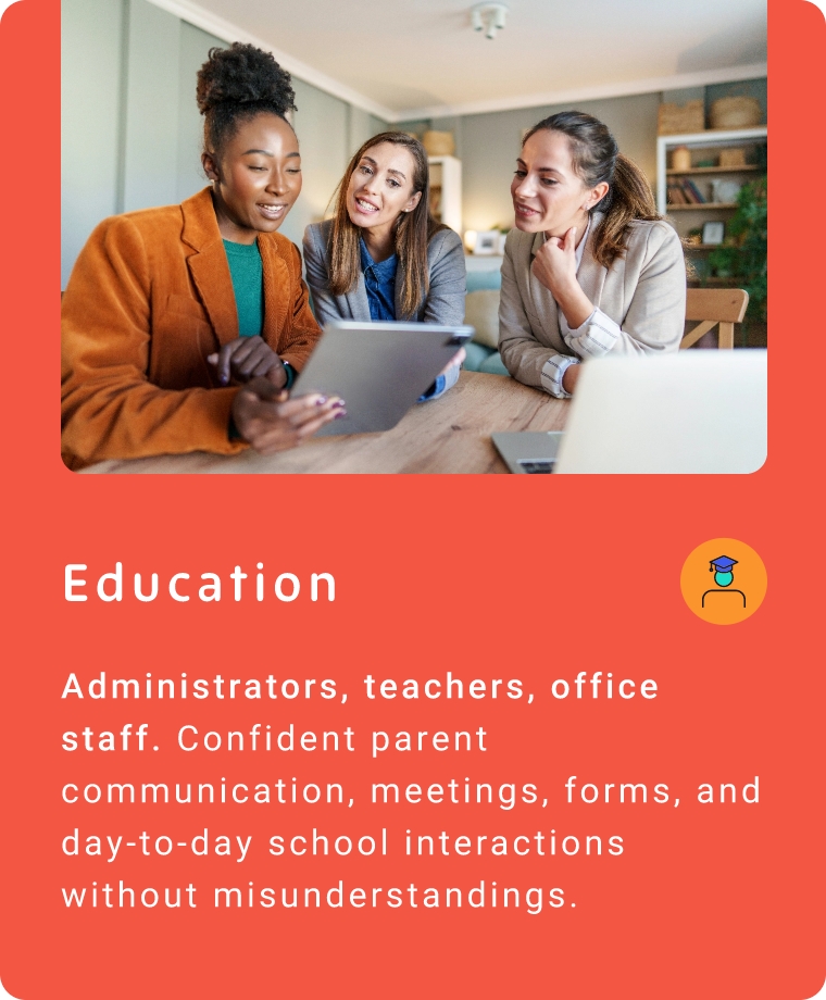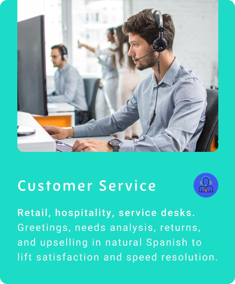 Spanish for your team. Real conversations. Real results. Spanish for your team. Real conversations. Real results. Train your staff to serve, sell, and collaborate in Spanish. Confidently and professionally. Book a Free Consultation Book a Free Consultation Why Vokally Speak-first, functional SpanishWe train for real conversations your team has at work. Right format, right pace.1:1 coaching or small groups (up to 5) to maximize talk time. Experienced instructorsBilingual coaches who understand U.S. workplace dynamics. One hub for everything.Schedule, notes, materials, and reports live in our Student Portal. Speak-first, functional Spanish We train for real conversations your team has at work. Right format, right pace. 1:1 coaching or small groups (up to 5) to maximize talk time. Experienced instructors Bilingual coaches who understand U.S. workplace dynamics. One hub for everything. Schedule, notes, materials, and reports live in our Student Portal. Proven track 3,000+ classes/year · 300+ learners served Industries we serve Book a Free Consultation What’s included in everycorporate program What’s included in everycorporate program PLACEMENT & PLAN Morning, midday, or evening—within our regular timetable. SCHEDULING 50-minute lessons · 1:1 or small groups (up to 5). MATERIALS Level-aligned videos, audio, and PDFs—ready to use. AFTER-CLASS NOTES A short recap with clear next steps after each lesson. STUDENT PORTAL One place for schedule, notes, materials, and updates. MAKE-UPS & PAUSES Friday/Saturday make-ups and a simple pause policy. REPORTING Monthly attendance and progress summaries for managers. DELIVERY Live online via Zoom. Ready to get started? Ready to get started? Duration: 30 minutesCost: Completely freeWhat you need: Just bring yourself and your goals PRO TIPUse a laptop or tablet for the best experience — you’ll be able to see materials clearly and participate fully. This is your moment. Take the first step toward confident, fluent Spanish. Choose your preferred timebelow and let’s get started. No pressure, no commitment. just clarity on your path forward.