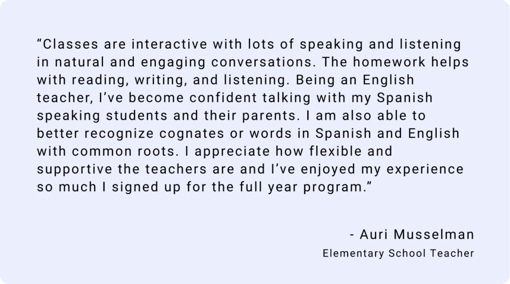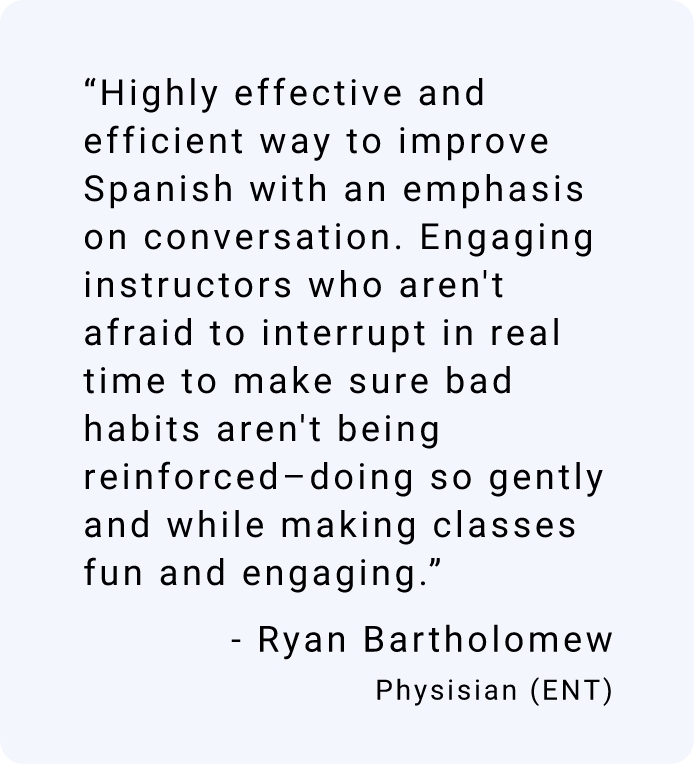 That depends on how often you take lessons and how much Spanish you use in daily life. With 2-4 lessons per week, most students see strong conversational results in 6–12 months. Our full